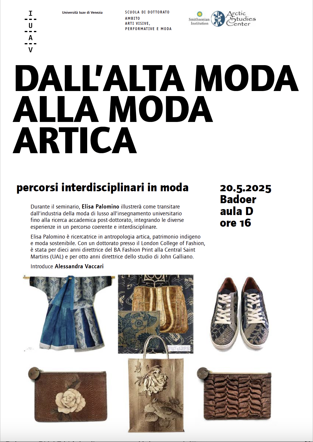 During the seminar Dall'alta moda alla moda artica hosted by the Doctoral School in Visual, Performing and Fashion Arts at IUAV University in Venice and introduced by Alessandra Vaccari, I presented my professional and academic journey—from leading roles in the luxury fashion industry to university teaching, and onward to postdoctoral research. I demonstrated how these different phases form an integrated, interdisciplinary path that combines design practice, critical theory, and collaborative research. This trajectory exemplifies how creative industries expertise can be mobilised within academic contexts to generate new methodologies and insights.